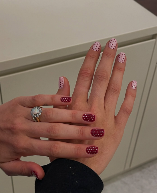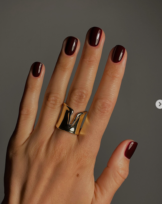 على عكس المتوقع في فصل الربيع، يفرض العنابي الداكن حضوره بقوة. يضيف هذا اللون لمسة من العمق والجاذبية، سواء اخترتِ اللمسة اللامعة أو “المطفيّة” (Matte). إنه الخيار الأمثل لمن ترغب في إطلالة تعكس الثقة والقوة مع الحفاظ على الكلاسيكية.