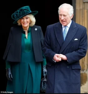 وكانت كاميلا، قد ظهرت بإطلالة أنيقة بفستان أخضر زمردي أنيق من تصميم آنا فالنتين، وأكملت إطلالتها بعباءة من تصميم أماندا ويكلي وقبعة عريضة الحواف من تصميم صانع القبعات الشهير فيليب تريسي وأضافت إكسسوارات مثل حقيبة شانيل الكلاسيكية، وقفازات جلدية أنيقة، وحذاء طويل يصل إلى الركبة من راسل آند بروملي.