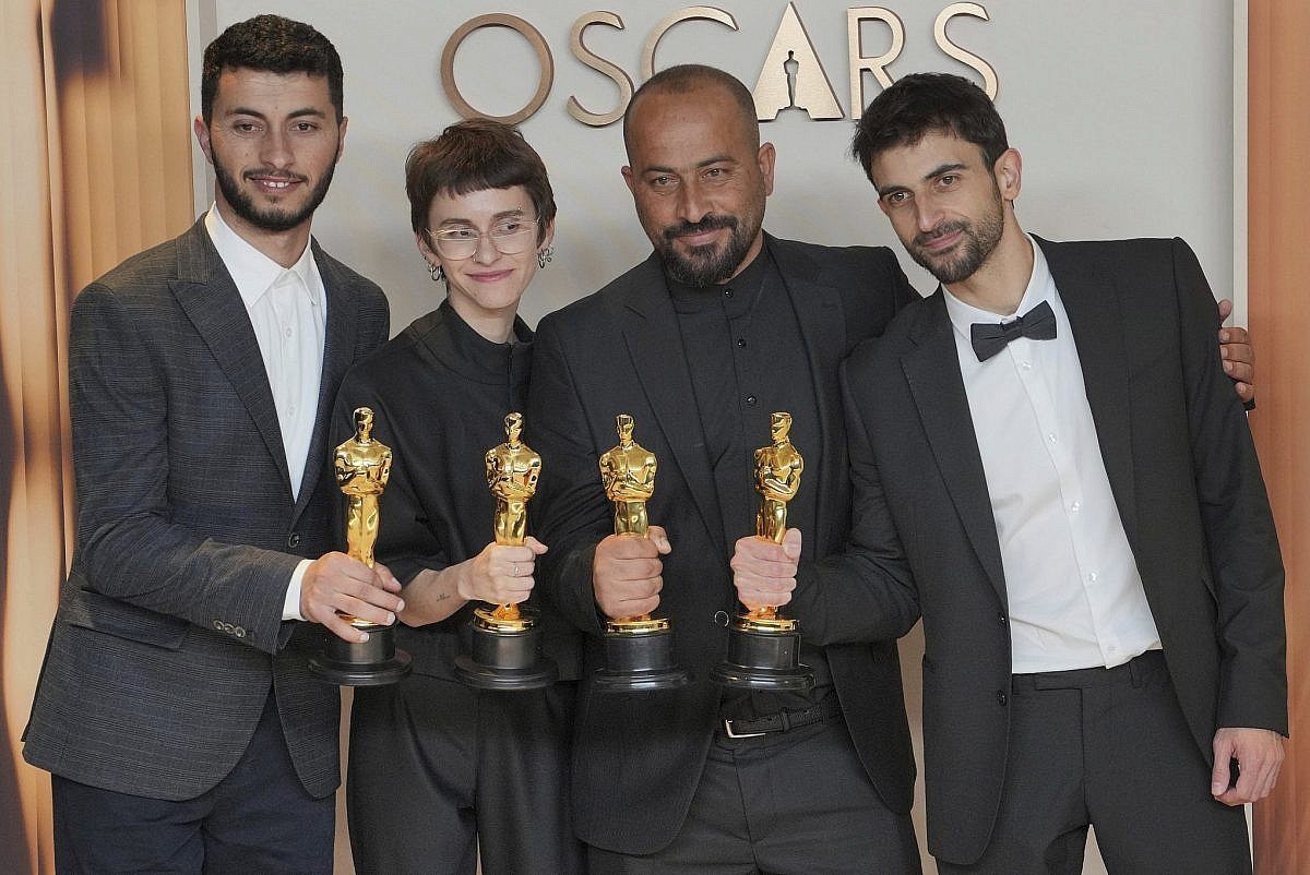 منتجو “لا أرض أخرى”، من اليسار إلى اليمين: حمدان بلال الحريني، يوفال أبراهام، باسل عدرا، وراشيل سور. (أورن زيف)